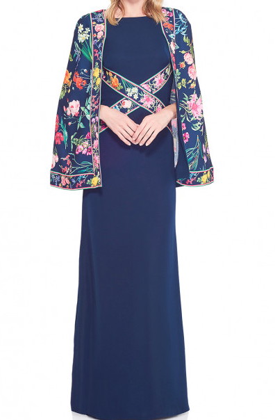 再販売!Tadashi Shoji タダシショージ ケープ付きフローラルロングドレス ネイビー