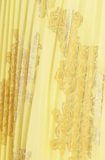 明るいイエローカラーにゴールドのプリントがゴージャスなプリーツドレスです。