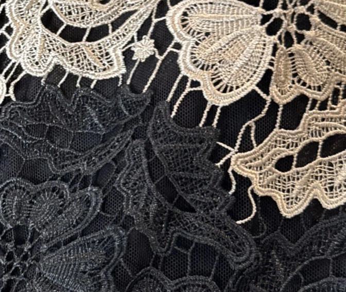 ブラックを基調に、ベージュのフローラルレースを重ねたツートーンデザインが、モダンでありながら女性らしい華やぎを演出します。繊細な総レース素材は軽やかで上質感があり、身体のラインを美しく引き立てる立体的なシルエットを実現。ノースリーブとラウンドネックのシンプルなデザインが、デコルテを上品に見せ、背面のキーホールディテールがさりげない抜け感を添えます。