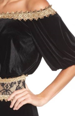 ブラックのベルベットドレスに、ゴールドの刺繍レーストリムがゴージャスなロングドレスです。