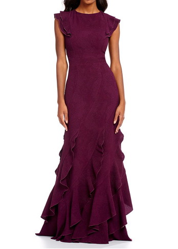 大人っぽく落ち着いたお色が素敵なドレスに、肩やスカートのラッフルが華やかでフェミニンなドレスです。