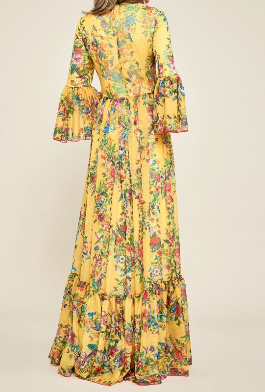 明るいイエローに、上品な花柄が美しいロングドレスです。