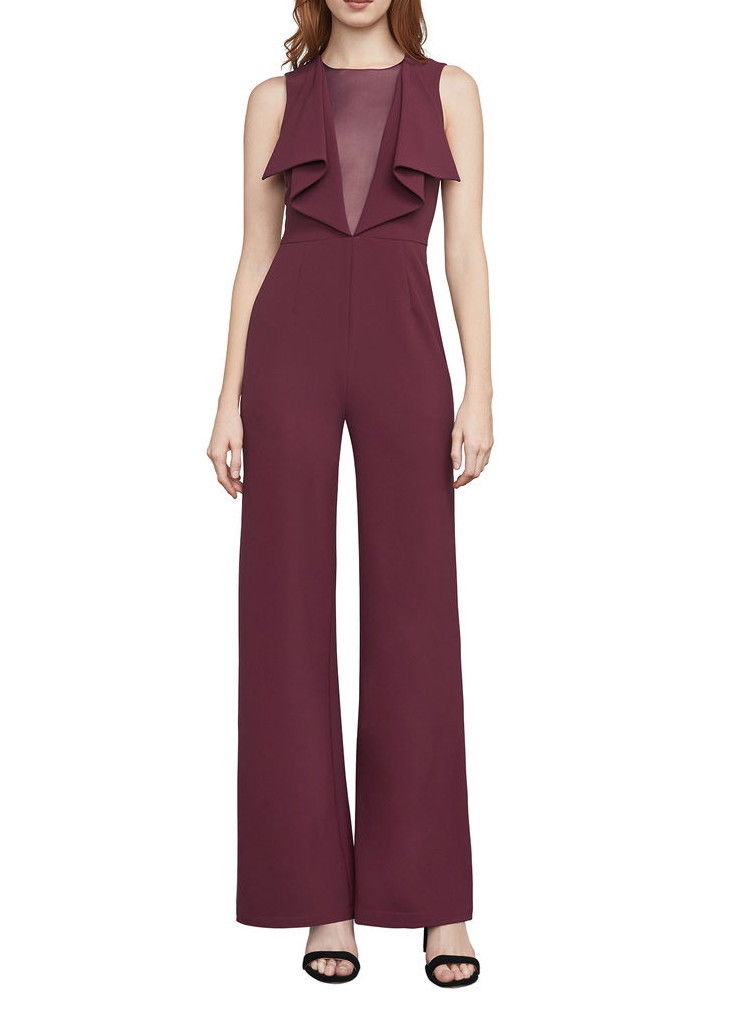 セクシーなメッシュのVネックにキャスケードラッフルが華やかなジャンプスーツです。