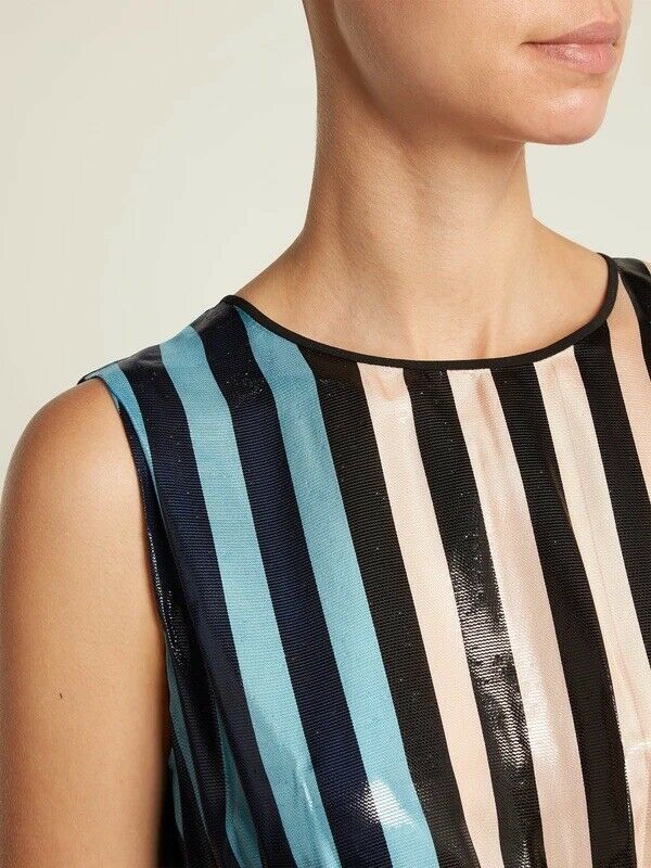 ブルーやブラックなどのメタリックのストライプがクールで華やかなドレスです。