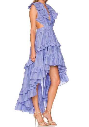 スクリーン越しにも目を奪われた、軽やかなアイリスブルーのフリルロングドレス。パリの街並みに映えたあの一着が、いま手に入ります。