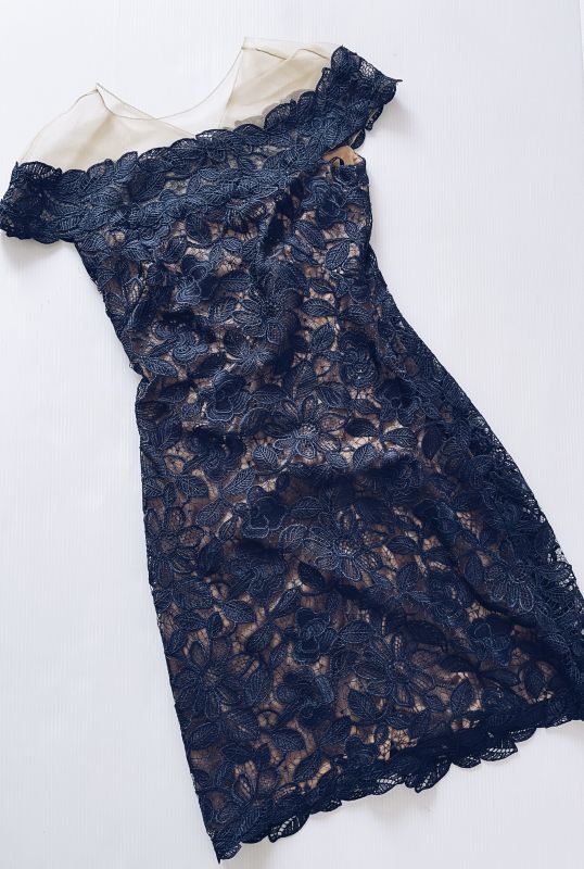 1点のみ即発!Tadashi Shoji タダシショージ Illusion Off-the-Shoulder Dress ネイビー 52101
