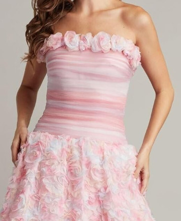 ドレス全体に施されたロゼットアップリケは、立体的に重ねられた花びらが光と影を生み、写真でも実物でも奥行きのある美しさを演出します。単なるプリントではなく、丁寧に仕立てられた装飾が、タダシショージのクチュール感を感じさせます。