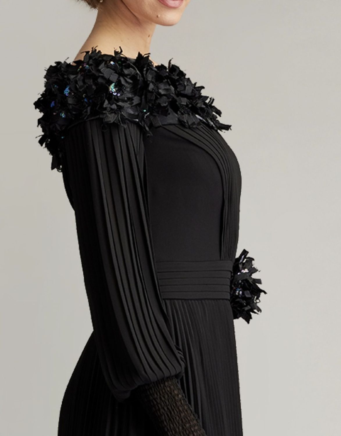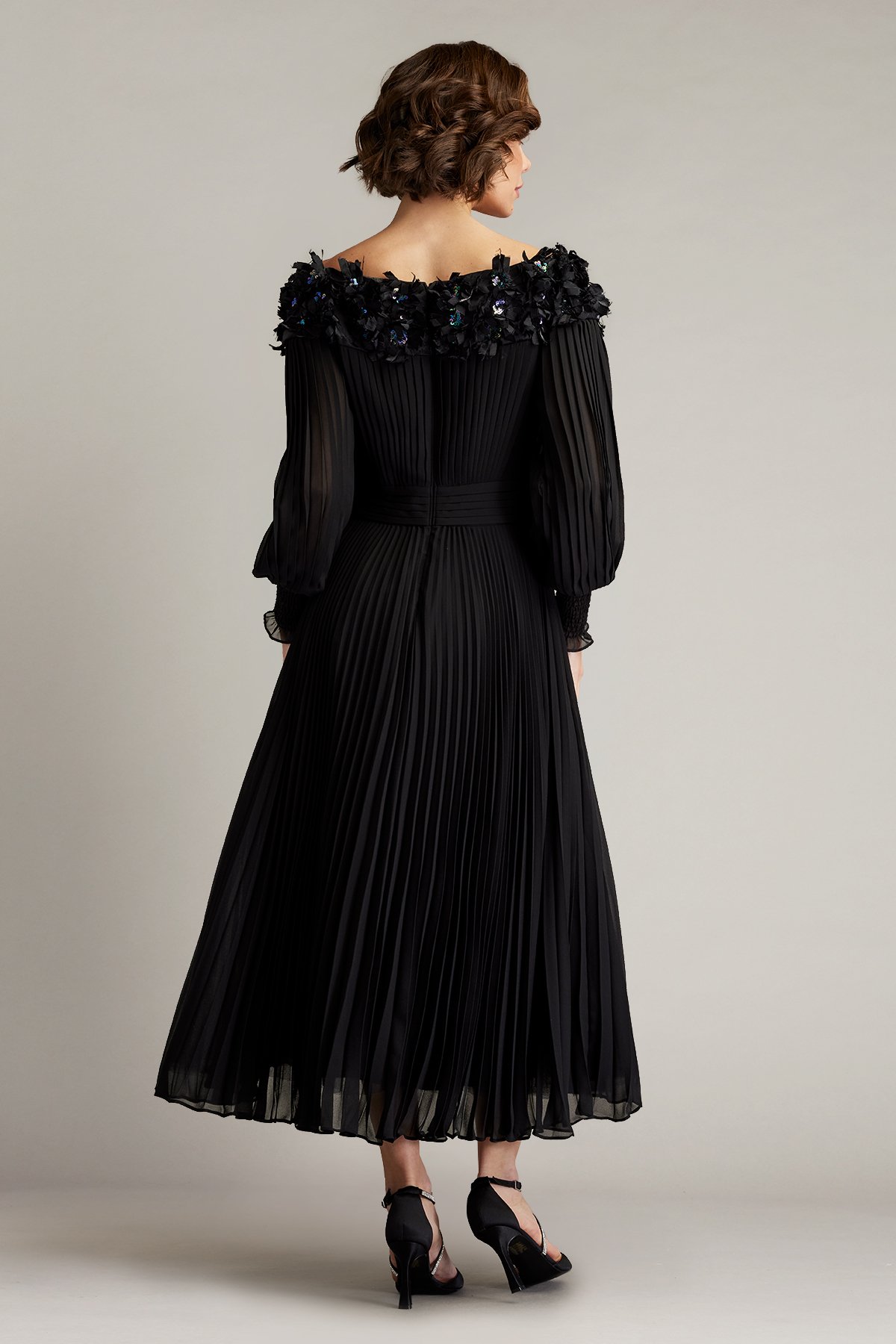 セール!Tadashi Shoji タダシショージ OWAN プリーツフローラルアップリケドレス ブラック