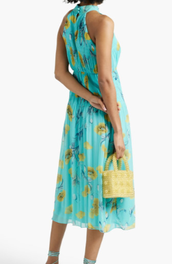 明るいブルーに黄色の花柄が映えるワンピースです。