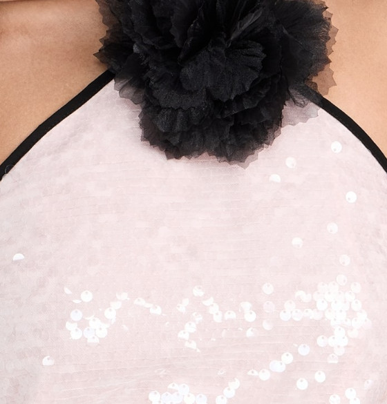 キュートなペールピンクのスパンコールがフェミニンなミニドレスです。