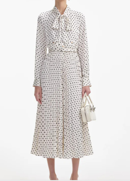 白いドレスに黒のドット柄がフェミニンなドレスです。
