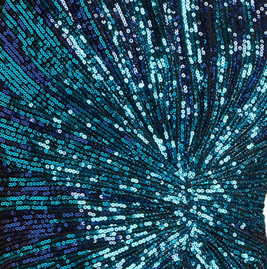 ブルーとグリーンのグラデーションスパンコールが織りなす輝きが、見る角度によって異なる表情を見せる華やかな一着です。ウエストラインに向かって流れるように配されたギャザーデザインが、スタイルアップを叶えつつ女性らしい曲線美を際立たせます。上品な丈感とノースリーブのシルエットで、軽やかさとエレガンスを両立。