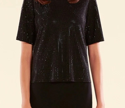 控えめな光沢を放つトップスは、クールなスタッズが上品に輝き、シンプルな中にも確かな存在感を演出します。