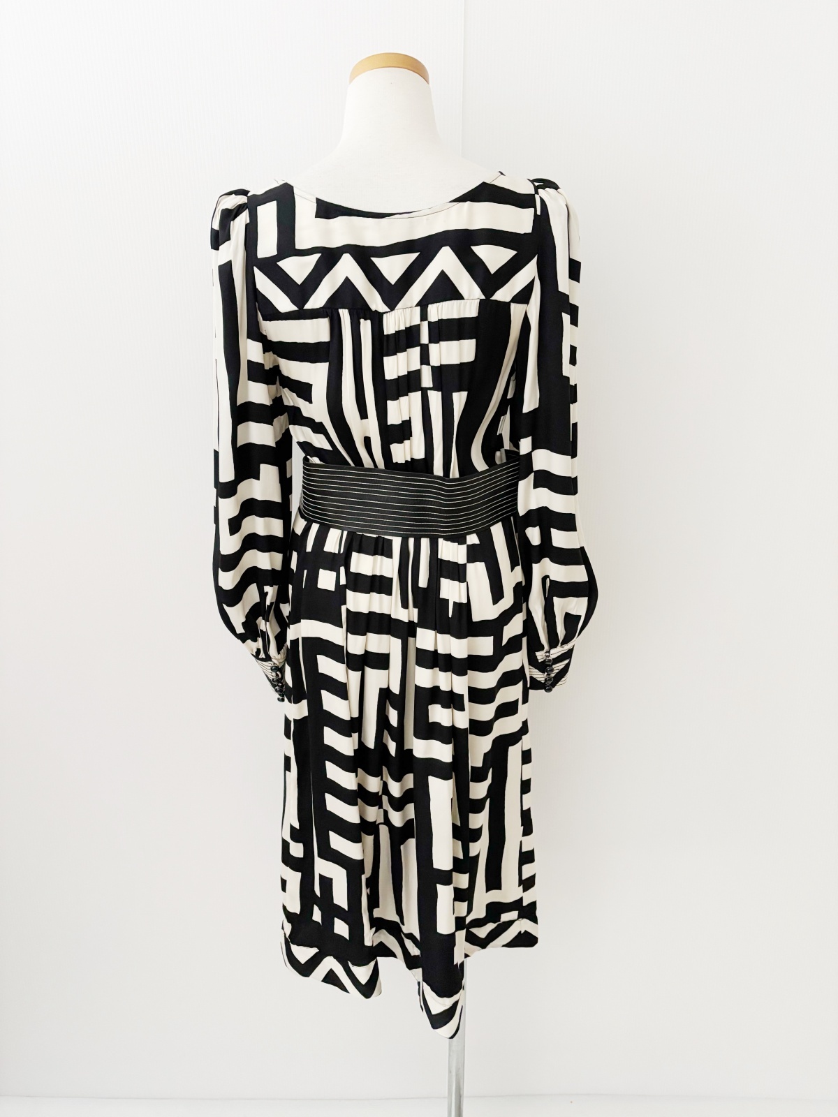 アメリカ・ニューヨーク発の人気ブランド〈Tracy Reese(トレーシー・リース)〉による、芸術的なプリントが印象的なブラック×ホワイトドレス。上質なレーヨン、シルク混素材を使用し、軽やかで滑らかな肌触りを実現。グラフィカルな幾何学模様がモダンで洗練された印象を与え、着る人の個性とエレガンスを際立たせます。ウエスト部分の太めベルトが女性らしいラインを引き締め、ふんわりとしたスリーブと優美なシルエットが動くたびに美しく揺れます。