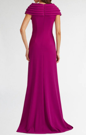 鮮やかなマゼンタカラーが印象的な〈Tadashi Shoji(タダシショージ)〉“Talise Waterfall Flounce Gown”。