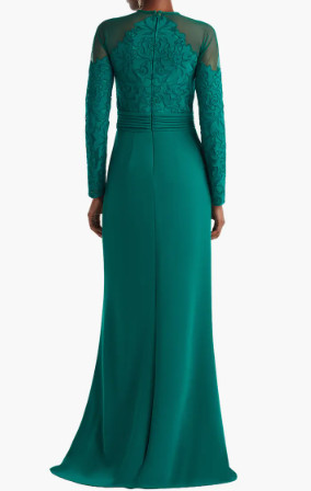 深みのあるエメラルドグリーンが大人の気品を引き立てる〈Tadashi Shoji(タダシショージ)〉“Sinclair Embroidered Crepe Gown”。
