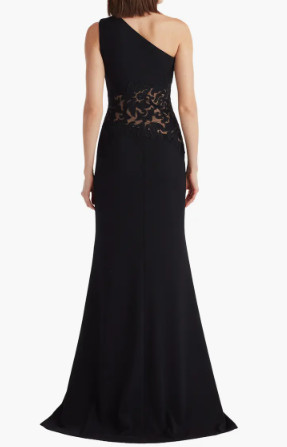 片肩のワンショルダーデザインが洗練された美しさを引き立てる〈Tadashi Shoji(タダシショージ)〉“Verrier One-Shoulder Illusion Gown”。