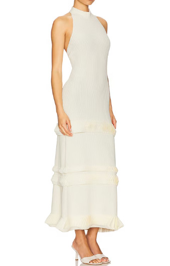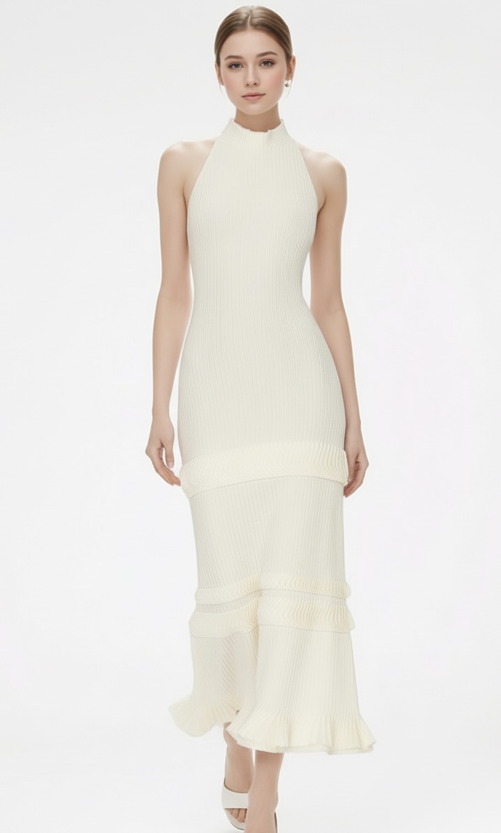 柔らかく伸びのある高級ニットのデザインで、身体のラインを優しく包み込みながら、美しいシルエットを描きます。特に目を惹くのは、全体に施された立体プリーツディテール。光を受けてふわりと揺れ、エレガントな存在感を纏います。ハイネックのホルターデザインがデコルテと肩を美しく見せ、バックスタイルは大胆なオープンバックで大人の女性らしい艶感を演出。