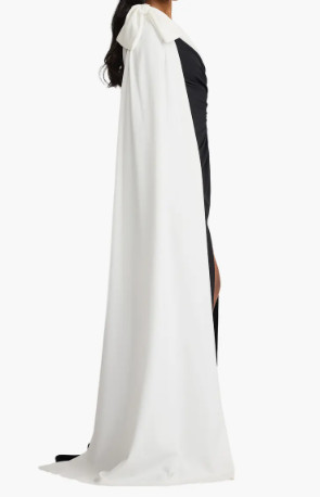 ブラックを基調とした流麗なロングドレスに、アイボリーのケープと立体的なボウディテールを組み合わせた、視線を惹きつけるバイカラーデザインが特徴です。ワンショルダーのアシンメトリーな構築がデコルテを美しく演出し、縦に流れるケープがスタイル全体をすっきりと見せてくれます。
