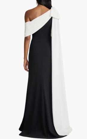Tadashi Shoji Romi ワンショルダー ケープボウ ロングドレス|バイカラーフォーマル|ブラック、ホワイト