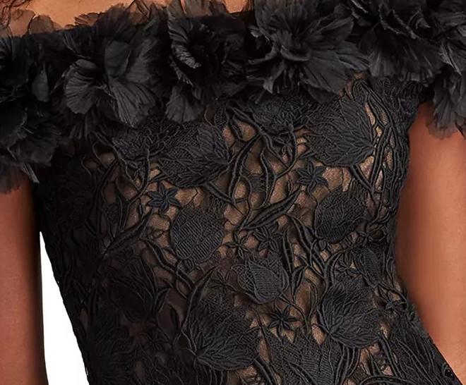 Tadashi Shoji Margaux オフショルダーフローラルラッフル ロングドレス|ブラックフォーマル