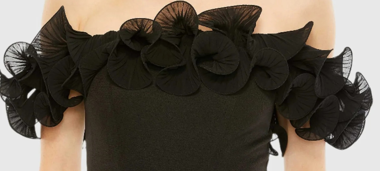 Mac Duggal フリルオフショルダー ロングドレス|ブラック イブニングガウン