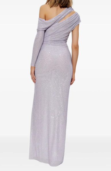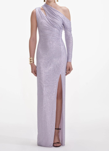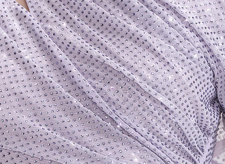 淡く上品なライラックカラーが肌を明るく見せ、透明感のある華やかさを演出します。しなやかに身体に沿うストレッチ素材に、計算されたギャザーとワンショルダーデザインを組み合わせることで、スタイルアップ効果とエレガントな動きを両立。程よいスリットが足元に抜け感を与え、歩くたびに女性らしい余韻を残します。