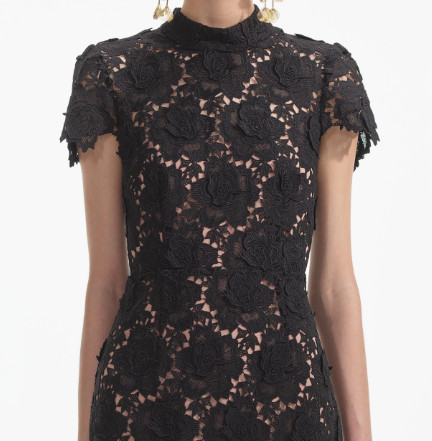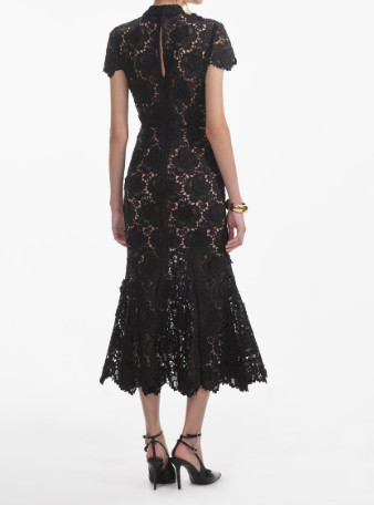 Self Portrait(セルフポートレート)らしい繊細なクラフトマンシップが際立つ、ブラックのフラワーレースミディドレス。
