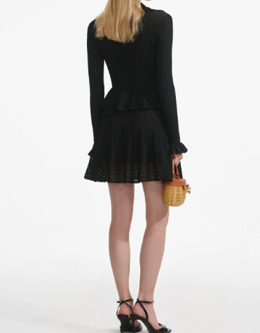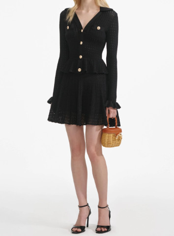 繊細な編み柄が印象的な、**Self-Portrait**のブラックポインールニットミニドレス。上質なニット素材を用いたボディラインに寄り添うシルエットと、デコルテを美しく見せるVネックが、大人の女性らしい洗練を演出します。ポイントレール編み特有の軽やかな透け感が、ブラックカラーに奥行きを与え、シンプルでありながら存在感のある一着に仕上がっています。