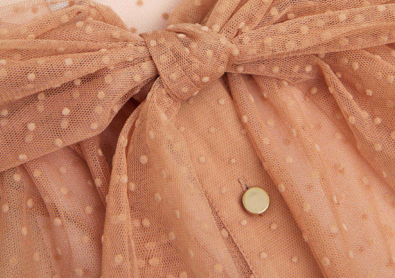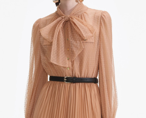 軽やかなチュール素材に細かなドットを施し、透け感と立体感を兼ね備えた表情豊かな一着です。首元は上品なハイネックデザインにリボンディテールを添え、顔まわりを華やかに演出。ウエストはベルトで程よく引き締められ、自然なスタイルアップ効果を叶えます。
