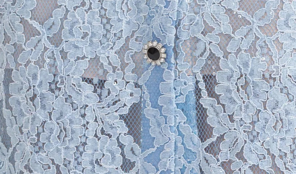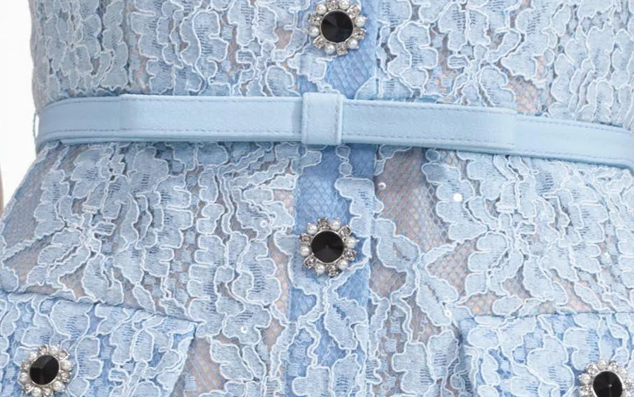 上質なフローラルレースを贅沢に使用し、透明感のあるブルーカラーが肌を明るく、知的で洗練された印象へ導きます。フロントに並ぶ飾りボタンのデザインとウエストベルトが、自然なメリハリを生み出し、スタイルアップ効果も抜群。