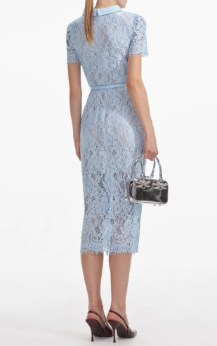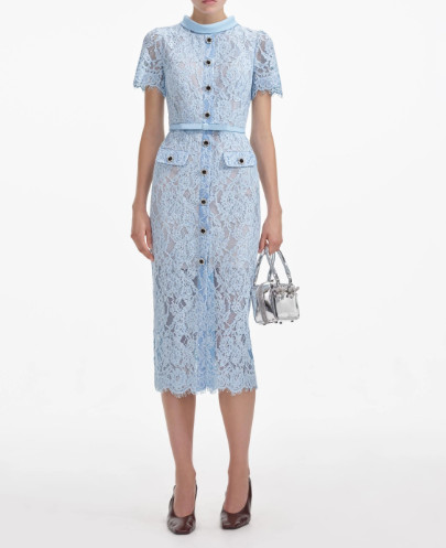 繊細なレースの美しさと構築的なシルエットを両立した、Self-Portraitのブルーレース ボタンミディドレス。