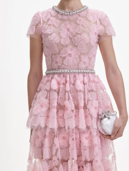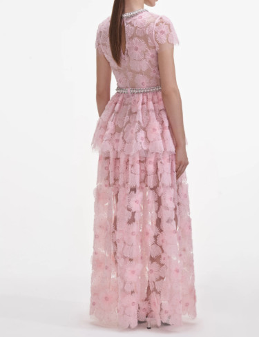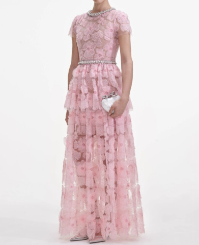 英国ブランド Self-Portrait らしい繊細な美しさが際立つ、ピンクのエンベリッシュドチュールマキシドレス。
