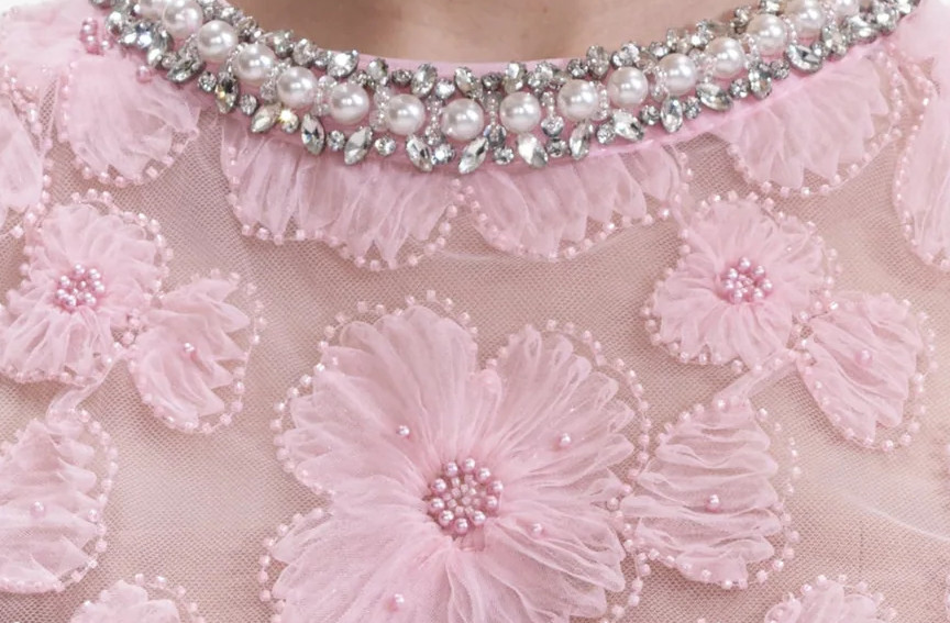 軽やかなチュール素材に、フラワーモチーフとビジュー装飾を重ねることで、動くたびに上品な輝きを放ちます。デコルテからウエストにかけては程よくフィットし、スカート部分はふんわりと広がるティアードデザイン。体のラインを美しく見せながらも、甘くなりすぎない大人のフェミニンさを演出します。