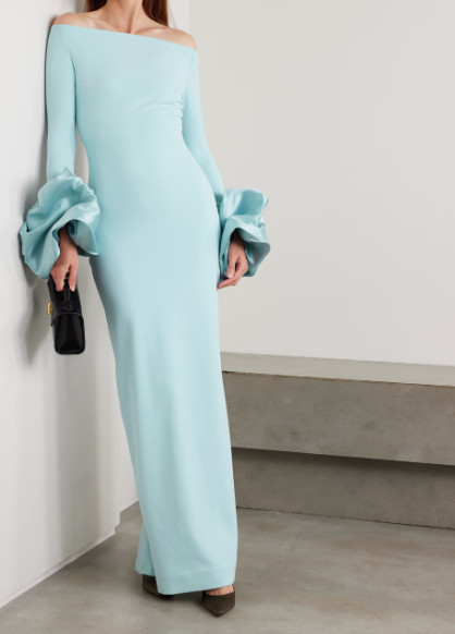 ロンドン発ブランド Solace London が提案する、構築的エレガンスが際立つ Talia オフショルダー ガウン。