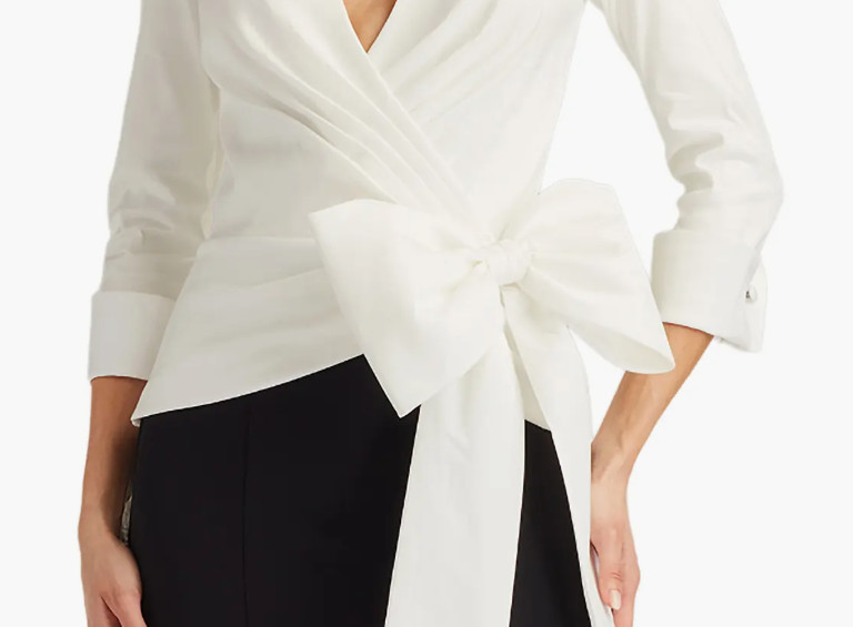 フロントの大きなボウ(リボン)ディテールがウエストラインを美しく見せ、自然なスタイルアップ効果も。程よく構築的なトップスと、落ち感のあるスカートのバランスが、大人の女性にふさわしい品格を演出します。