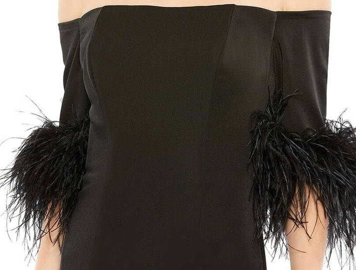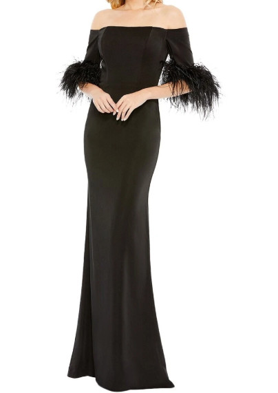 Mac Duggal(マックドゥガル)Feather Trim Column Gownは、洗練されたブラックドレスに“非日常のエッセンス”を添えた、大人のためのイブニングガウンです。