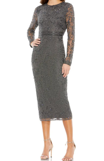 Mac Duggal(マックドゥガル)のビーデッド・ティーレングスシースドレスは、クールビューティーな印象で、それでいて一目で上質と伝わる、洗練されたグレーカラーが印象的です。光を受けるたびに繊細なビーディングがさりげなく煌めき、大人の女性にふさわしい気品を纏わせてくれます。