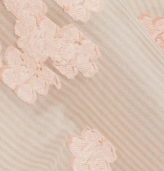 軽やかなチュールベースに、糸を浮かせて織り込むフィルクーペ技法で描かれたフローラルモチーフ。奥行きのある質感が、光の角度によって表情を変え、写真やステージ照明の下でも美しく映えます。繊細でありながら高級感を感じさせる素材感は、30〜50代の富裕層女性にふさわしい仕上がりです。