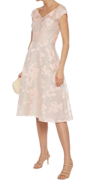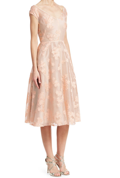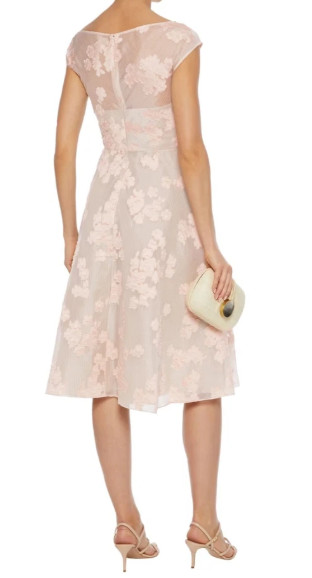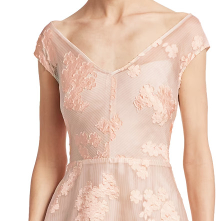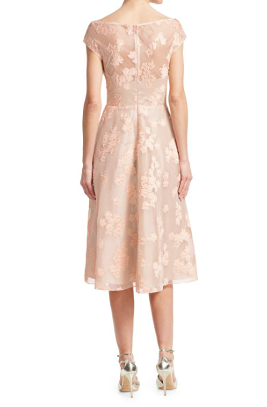 Lela Rose(レラローズ)Open Neck Fil Coupé Floral Fit-&-Flare Dress は、大人の女性が持つ“静かな華やぎ”を美しく引き出すフラワードレスです。淡くやさしいピンク系の色調は肌なじみが良く、上品で洗練された印象を与えながら、決して埋もれない存在感を放ちます。