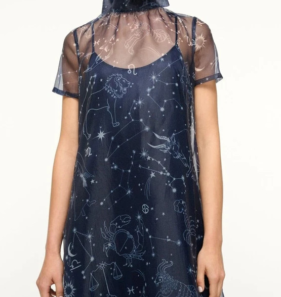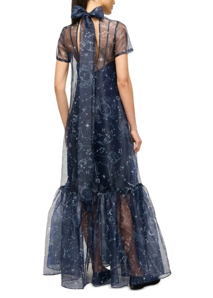 夜空を思わせる深いネイビーに、星座モチーフを繊細に描いたSTAUD Calluna High Neck Tie Organza Maxi Dress Gown(ネイビー)。透け感のあるオーガンザ素材が重なり合い、歩くたびに静かな輝きを放つ、知的で詩的な一着です。