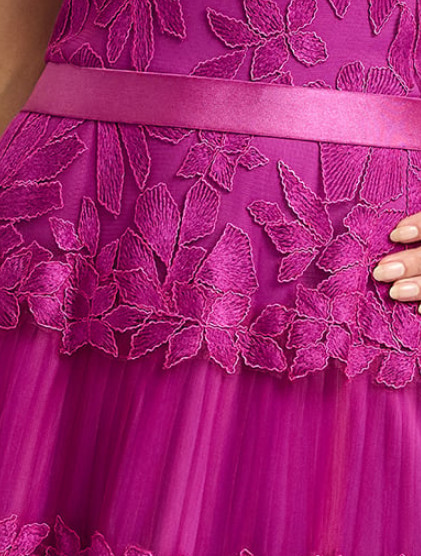 タダシショージ(Tadashi Shoji)のAdriane Floral Embroidered Tea-Length Dressは、繊細なフローラル刺繍と軽やかなチュールを重ねた、気品と華やかさを兼ね備えるティーレングスドレス。