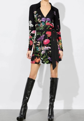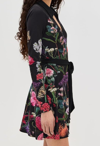 ブラックベースに色鮮やかなボタニカルフローラルが咲き誇る、印象的な花柄ラップドレス。ドラマの中でも凛とした存在感を放ち、都会的で自信に満ちた女性像を体現しました。