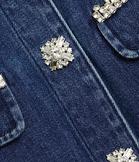程よい厚みのインディゴデニムは、身体のラインを拾いすぎず、立体的にシルエットを整えてくれるのが魅力。襟元と胸ポケット、フロントのトリムに施されたクリスタル装飾が、光を受けて繊細にきらめきます。