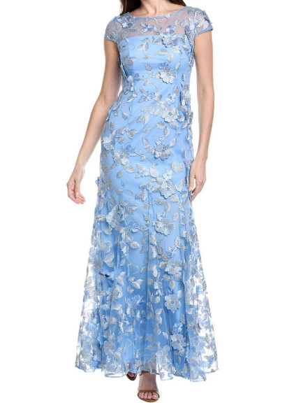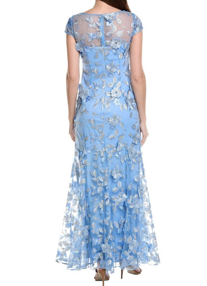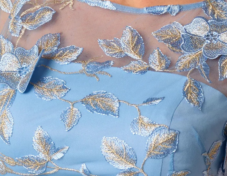 透明感のあるライトブルーに、繊細なフローラル刺繍を重ねたAdrianna PapellのCap Sleeve Floral Embroidered Illusion Godet Gown。