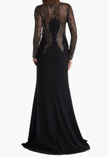 最大の特徴は、視線を自然に縦へ導くスパンコール刺繍のデザインです。曲線的に配置された刺繍がウエストラインを引き締め、スタイルアップ効果を生み出します。また、デコルテから袖にかけてのシアー素材が抜け感を演出し、長袖でありながら重く見えません。滑らかなロングスカートは動きに合わせて美しく流れ、歩く姿まで優雅に見せてくれるのも魅力です。