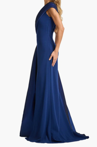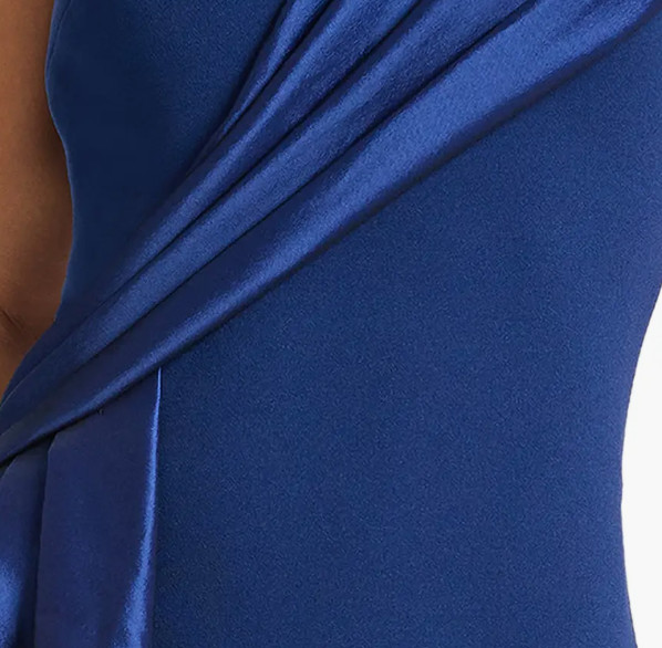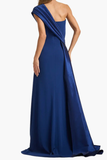 最大の特徴は、肩からウエストへと流れる大胆なドレープデザイン。ワンショルダーからのドレープはタフタ素材で、高級感のある程よい光沢が美しいです。斜めに入る立体的なラインがウエストを引き締めて見せ、自然なスタイルアップを実現します。ボディラインに沿うシルエットは無駄な膨らみを抑え、裾にかけて滑らかに広がることで、歩くたびに優雅な動きを生み出します。ワンショルダーのカッティングはデコルテと肩のラインを美しく見せ、シンプルな中にモードな印象をプラス。さらに、背面へと続くドレープが後ろ姿にも動きを与え、どの角度から見ても美しく映える設計です。生地は程よい厚みと滑らかな落ち感を兼ね備え、身体に沿いながらもラインを拾いすぎないため、安心感のある着心地を実現しています。