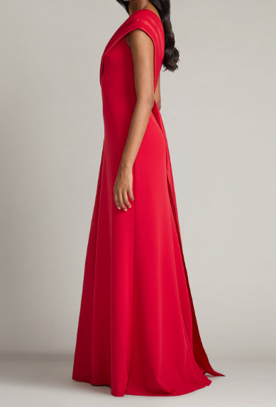 このBeis Draped One-Shoulder Gownは、タフタ素材の彫刻的なドレープを重ねたデザインが特徴です。ワンショルダーのネックラインに沿って入る立体的なドレープが、ボディを斜めに横切ることで自然なくびれ感をつくり、視覚的なスタイルアップを叶えます。トップはすっきりと身体に沿い、裾に向かってなめらかに広がるソフトな構築シルエットになっているため、縦のラインが際立ち、全身をすらりと見せてくれます。さらに、流れるようなスカートの分量感が歩くたびに優雅な動きを生み、前から見た華やかさだけでなく、横顔や後ろ姿にも余韻を残します。サイドはコンシールファスナー仕様で着脱しやすく、見た目の美しさを損なわない点も魅力。装飾に頼らず、素材と構造だけで高級感を表現しているため、ジュエリーや小物次第でよりフォーマルにもモダンにも着こなせます。