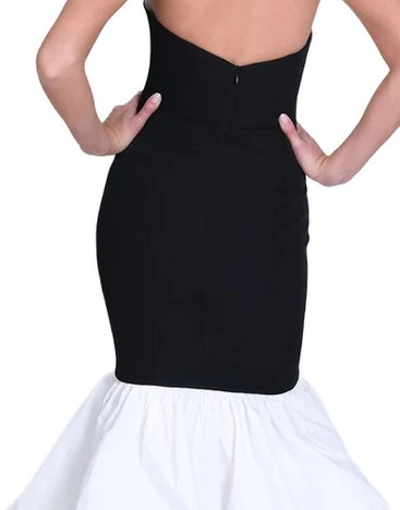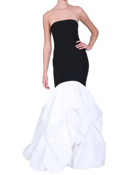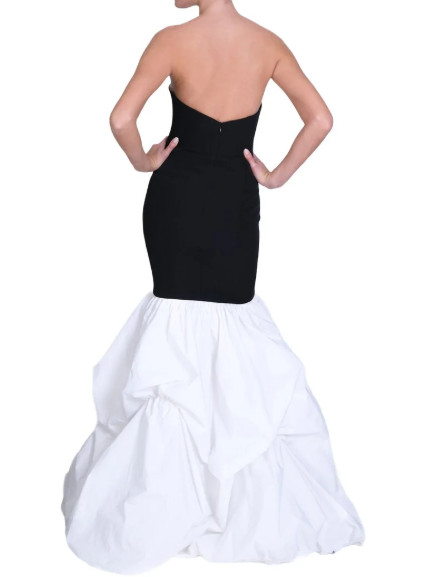 ブラックのトップが身体を引き締め、ホワイトのボリュームスカートがドラマティックな動きを生み出すことで、視線を一瞬で惹きつける構成になっています。単なるバイカラーではなく、上下の素材とシルエットの対比によって完成されたデザインは、パーティーやガラ、フォーマルシーンで「記憶に残る装い」を求める方に選ばれています。装飾に頼らず、構造そのもので魅せる力強さが、このドレスならではの魅力です。