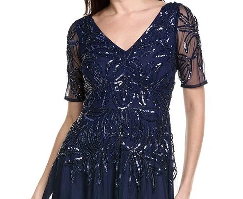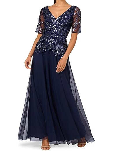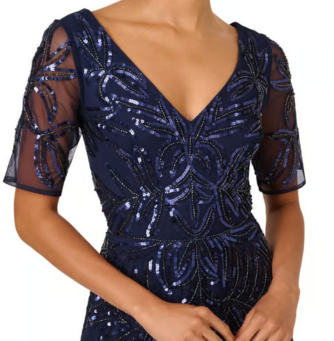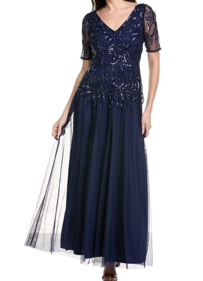 4/12までセール!Adrianna Papell アドリアナパペル ネイビー ビーズ刺繍メッシュロングドレス|パーティーフォーマル
